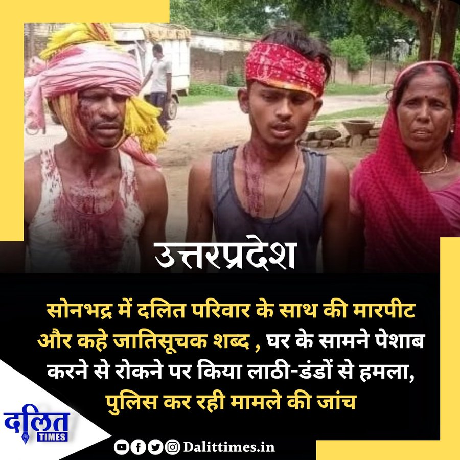 उत्तरप्रदेश- सोनभद्र में दलित परिवार के साथ की मारपीट और कहे जातिसूचक शब्द , घर के सामने पेशाब करने से रोकने पर किया लाठी-डंडों से हमला, पुलिस कर रही मामले की जांच pic.twitter.com/WuLEqztyKN