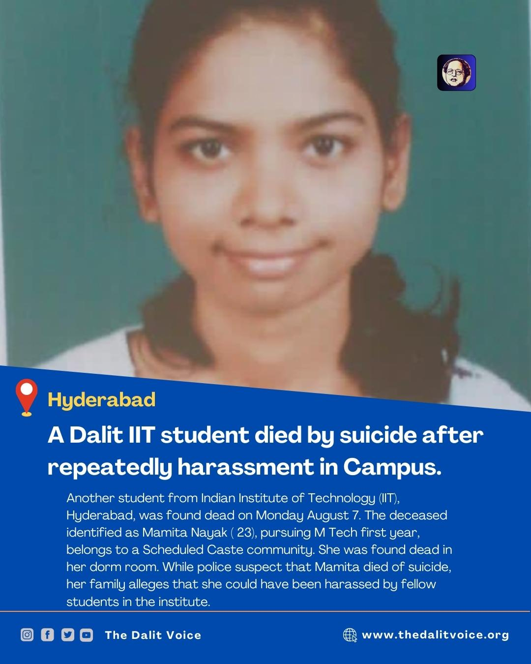 A Dalit IIT student died by suicide after repeatedly harassment in IIT Hyderabad. Another student from Indian Institute of Technology (IIT), Hyderabad, was found dead on Monday August 7. The deceased identified as Mamita Nayak ( 23), pursuing M Tech first year, belongs to a Dalit community. She was found dead in her dorm room. While police suspect that Mamita died of suicide, her family alleges that she could have been harassed by fellow students in the institute.