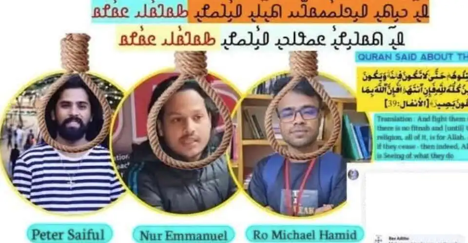 Posters have been pasted within the camps, and videos broadcast online, demanding the execution of three men for their alleged blasphemous acts through a fatwa.