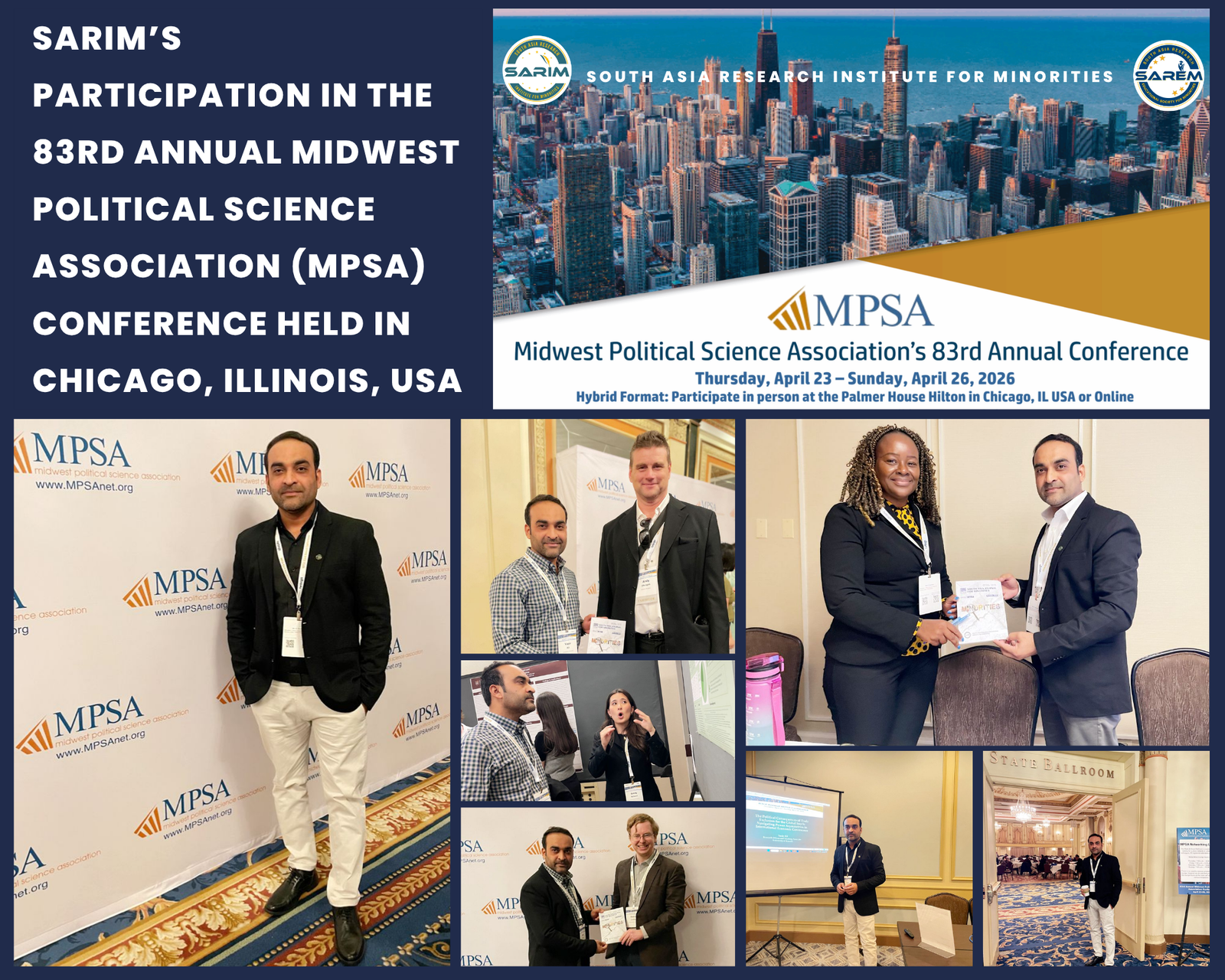 We are pleased to share that Yasir Ali, Associate Editor of the South Asia Journal for Minorities (SAJM), represented SARIM at the international level through his participation in the 83rd Annual Midwest Political Science Association (MPSA) Conference held in Chicago, Illinois, USA. During the conference, he contributed in multiple academic roles as an author, chair, and discussant, engaging with a range of critical and contemporary political science discussions.